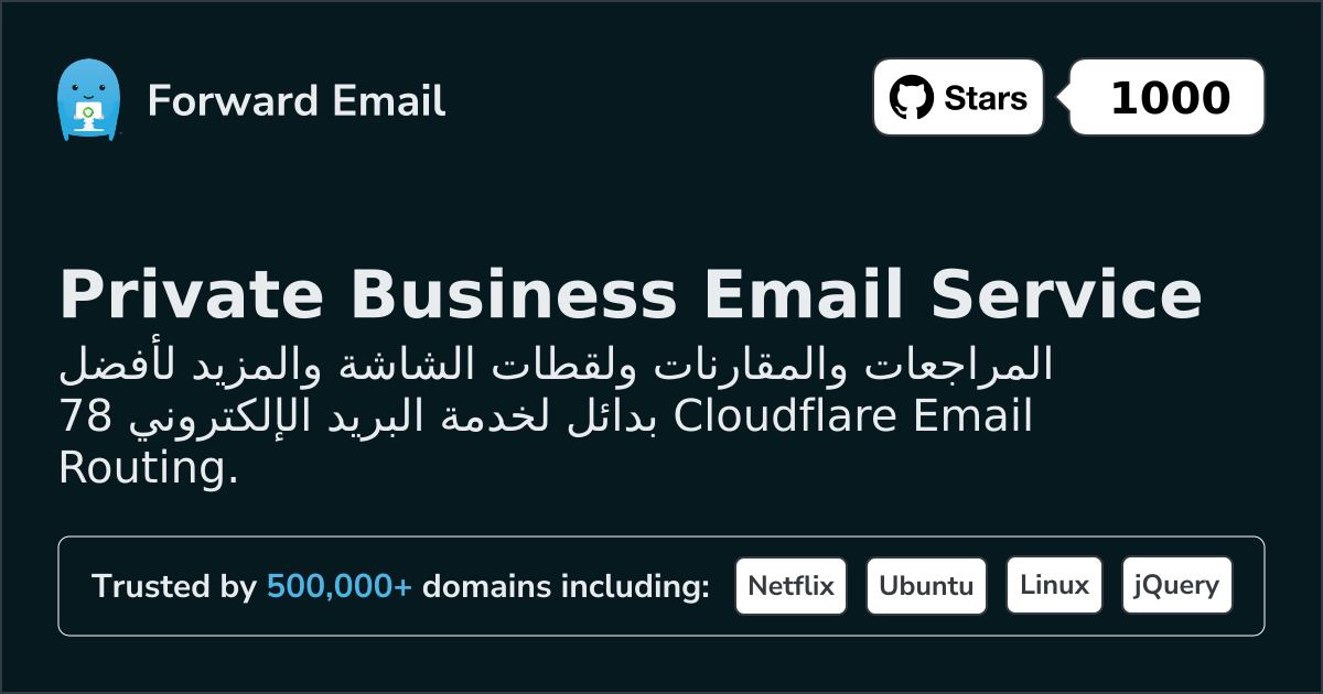Forward Email⭐ مفضلالبريد الإلكتروني للجميع | $3/mo | 10 GB pooled | 50 MB | نعم | نعم | نعم | نعم | تي تي اي | نعم | نعم | نعم | نعم | ⚠️ Opt-in | نعم | نعم |