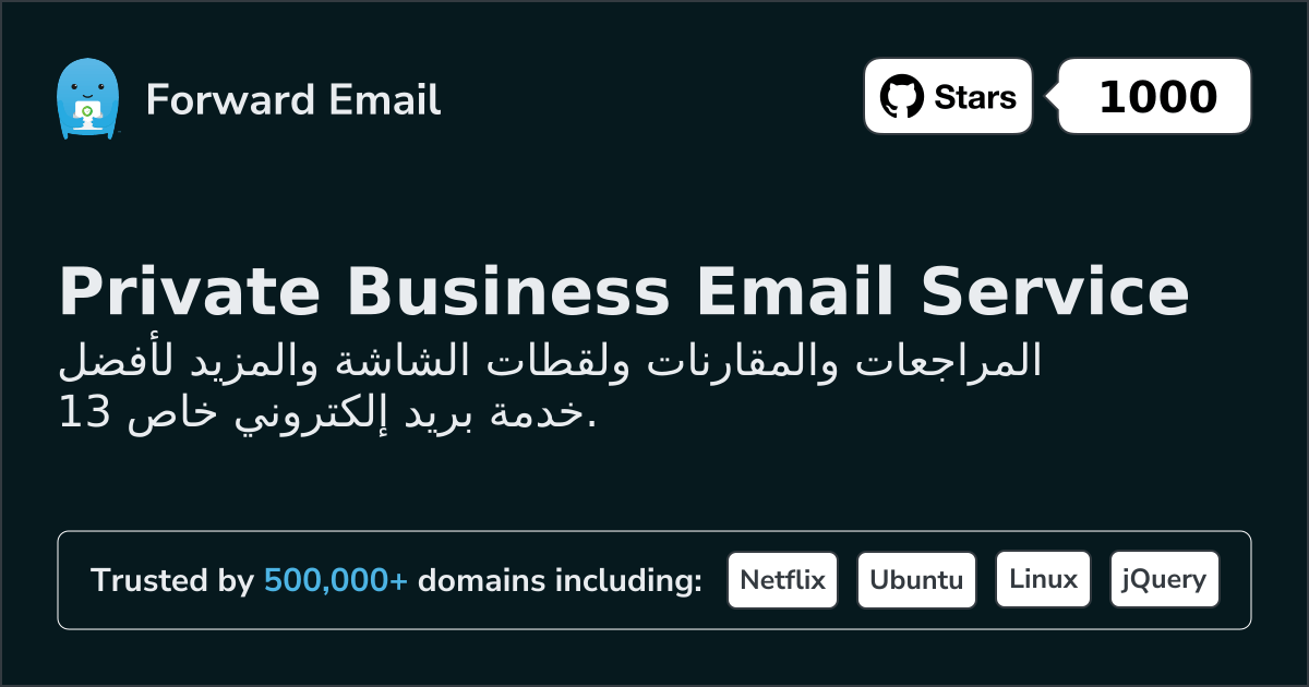 Forward Email⭐ مفضلالبريد الإلكتروني للجميع | $3/mo | 10 GB pooled | 50 MB | نعم | نعم | نعم | نعم | تي تي اي | نعم | نعم | نعم | نعم | ⚠️ Opt-in | نعم | نعم |