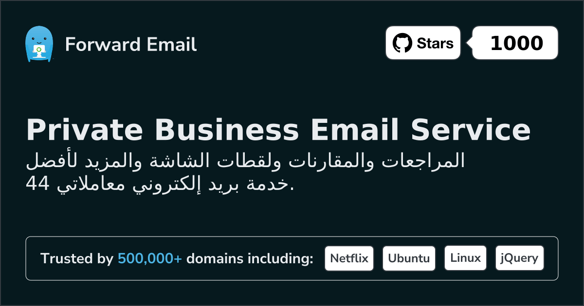 Forward Email⭐ مُستَحسَنالبريد الإلكتروني للجميع | $3/mo | 10 GB pooled | 50 MB | نعم | نعم | نعم | نعم | تي تي اي | نعم | نعم | نعم | نعم | ⚠️ Opt-in | نعم | نعم |