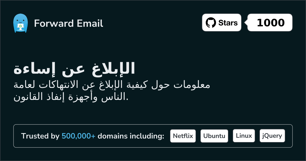 عنوان بريدنا الإلكتروني للتواصل معك بخصوص طلبك أو الإبلاغ عن إساءة الاستخدام هو: abuse@forwardemail.net