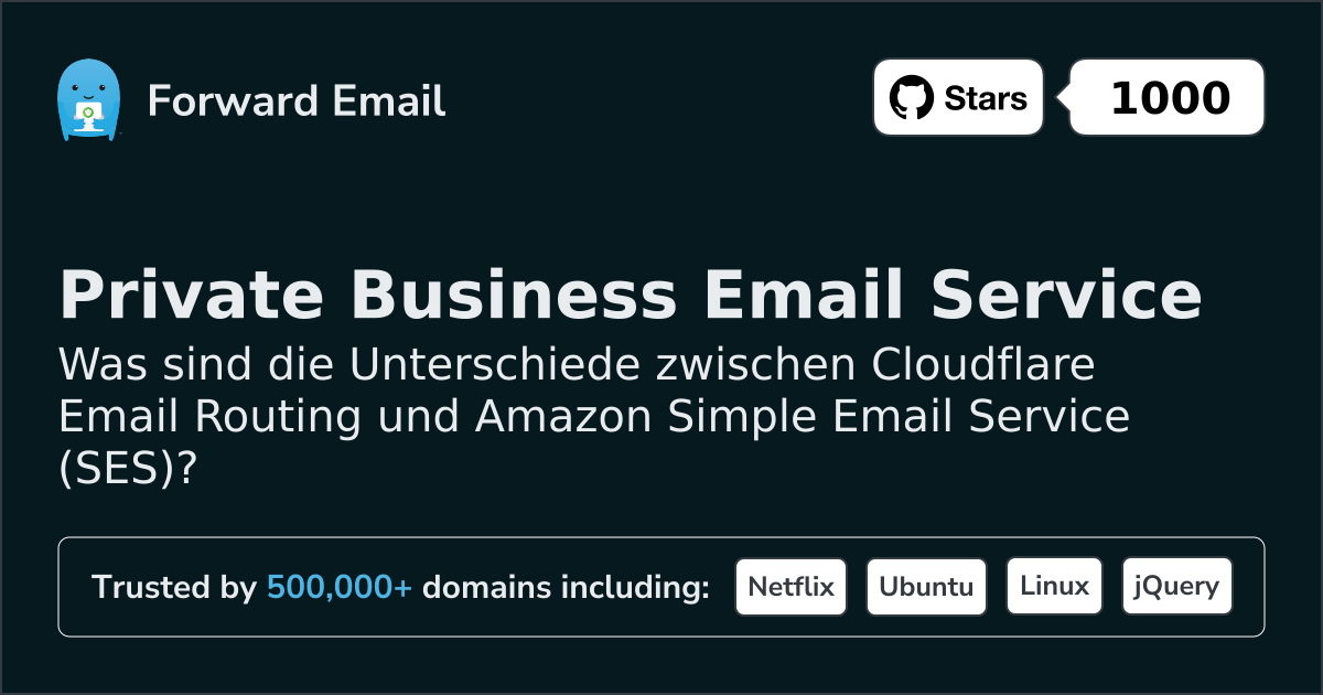 Cloudflare Email Routing"Einfaches Erstellen von Adressen und kostenloses Weiterleiten von E-Mails" | vs. | Amazon Simple Email Service (SES)"Erhalten Sie zuverlĂ€ssige, skalierbare E-Mail fĂŒr die Kommunikation mit Kunden zu den niedrigsten Preisen der Branche" |
