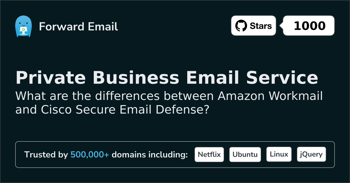 Amazon Workmail"Amazon WorkMail is a secure, managed business email and calendar service with support for existing desktop and mobile email client applications" | vs. | Cisco Secure Email Defense"Advanced protection to safeguard your inboxes" |