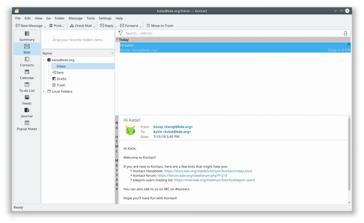 KMail (Kontact) is an open-source email client for Linux and is written in the C++ programming language. The official description from its website says, "KMail is the email component of Kontact, the integrated personal information manager from KDE."
