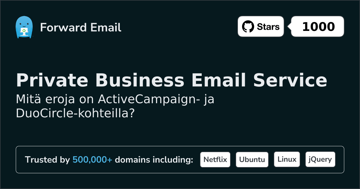 ActiveCampaign"Postmark, johtava transaktiosähköpostipalvelu, on nyt osa ActiveCampaignia" | vs. | DuoCircle"Suojaa sähköpostia tietojenkalastelulta, roskapostilta ja haittaohjelmilta" |