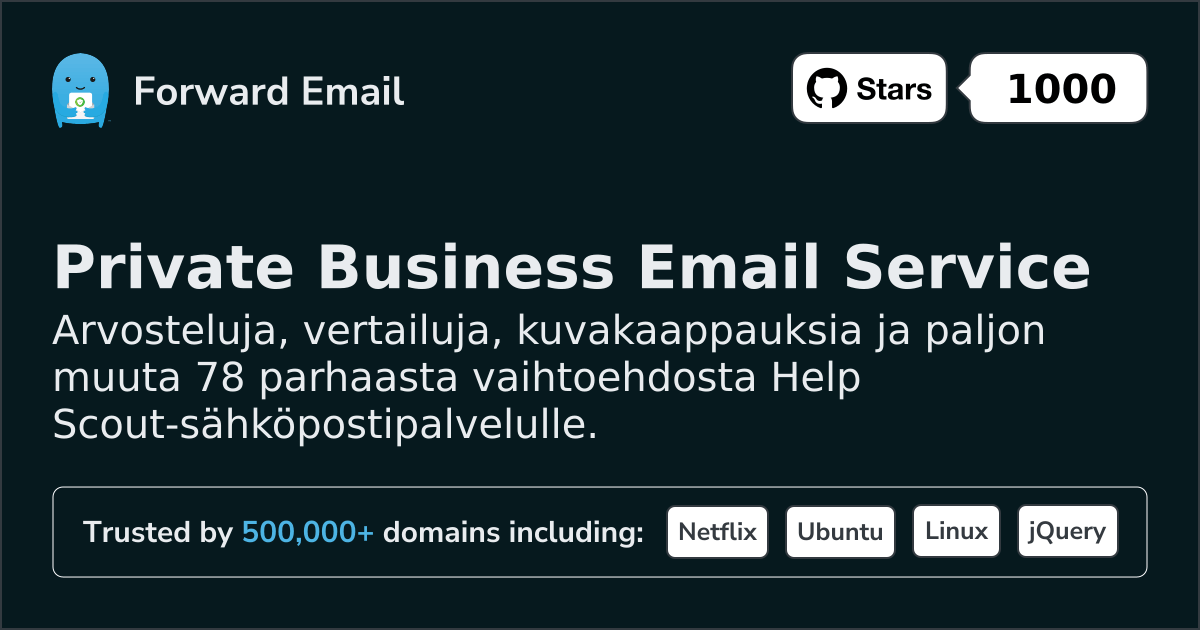 Forward Email⭐ SuositeltuSähköposti kaikille | $3/mo | 10 GB pooled | 50 MB | Kyllä | Kyllä | Kyllä | Kyllä | TTI | Kyllä | Kyllä | Kyllä | Kyllä | ⚠️ Opt-in | Kyllä | Kyllä |