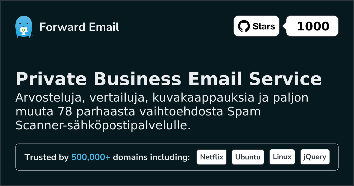 Spam ScannerRoskapostiskanneri on paras roskapostin torjunta-, sähköpostisuodatus- ja tietojenkalastelunestopalvelu | Free (built-in to Forward Email) | Requires 3rd party | Unknown | Ei | Ei | Ei | Ei | Ei | ❌ Requires 3rd party | ❌ Requires 3rd party | ❌ Requires 3rd party | Kyllä | Ei | Ei | Ei |