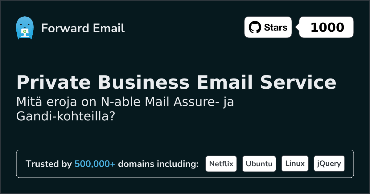 N‑able Mail Assure"Sähköpostin suojaus auttaa suojaamaan ja skaalaamaan" | vs. | Gandi"Hallinnoimme yli 780 000 sähköpostiosoitetta sähköpostipalvelimillamme, mikset siis sinunkin?" |