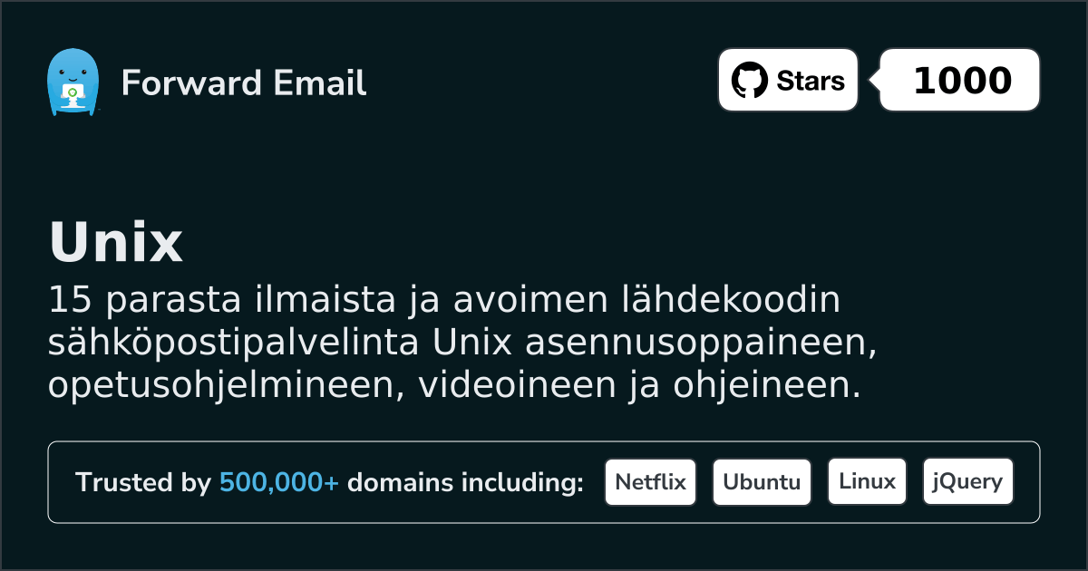 Forward Email on avoimen lähdekoodin sähköposti palvelin osoitteelle Unix. Virallisessa verkkosivuston kuvauksessa lukee "Tietosuojaan keskittyvää salattua sähköpostia sinulle. Olemme satojen tuhansien sisällöntuottajien, kehittäjien ja yritysten ensisijainen sähköpostipalvelu. Lähetä ja vastaanota sähköpostia muodossa sinä@omaverkkotunnus.com omalla mukautetulla verkkotunnuksellasi tai käytä jotakin meidän verkkotunnuksistamme."