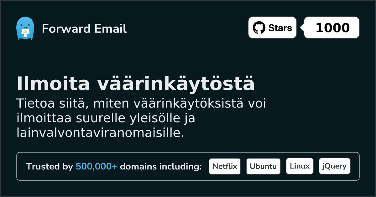 Sähköpostiosoitteemme, johon voit ottaa yhteyttä pyyntösi tai ilmoituksesi kanssa väärinkäytöstä, on: abuse@forwardemail.net