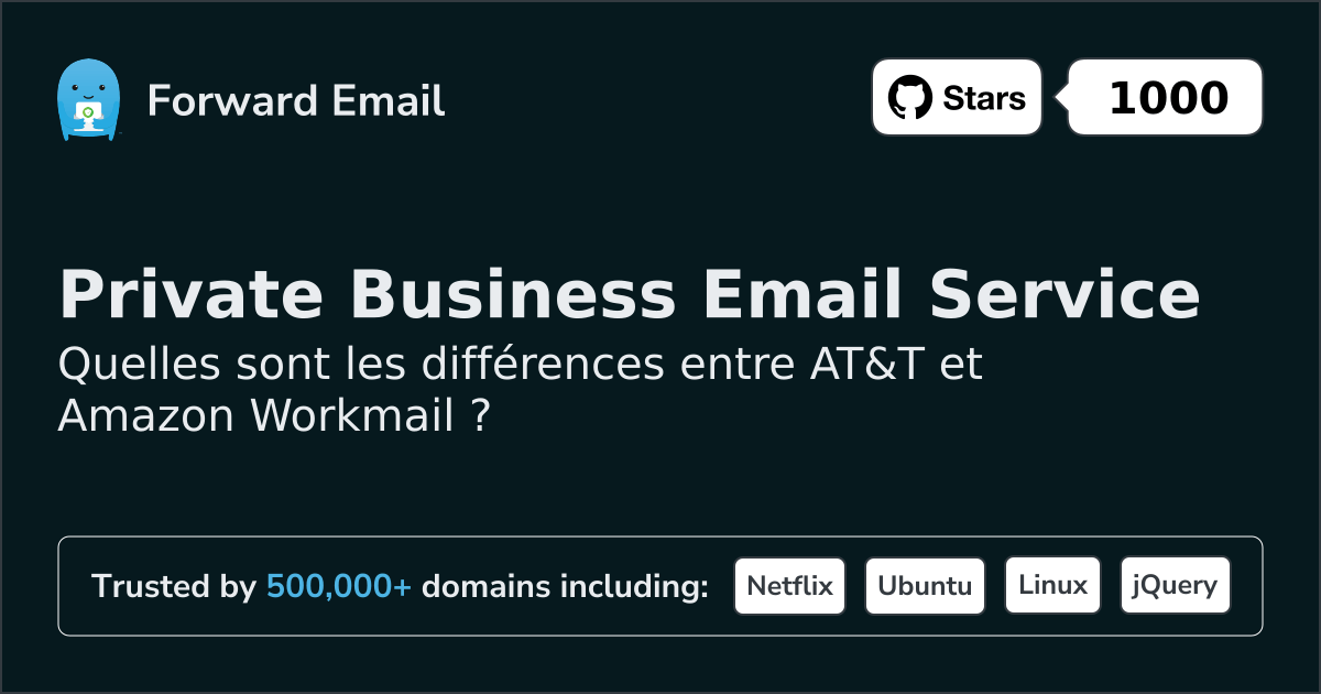 AT&T"AT&T Mail est désormais Yahoo Mail" | contre. | Amazon Workmail"Amazon WorkMail est un service de messagerie et de calendrier professionnel sécurisé et géré, prenant en charge les applications clientes de messagerie de bureau et mobiles existantes." |