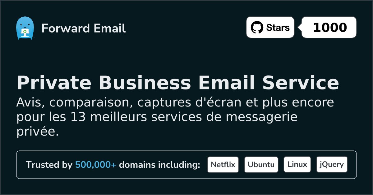 Forward Email⭐ PréféréLe courrier électronique pour tous | $3/mo | 10 GB pooled | 50 MB | Oui | Oui | Oui | Oui | TTI | Oui | Oui | Oui | Oui | ⚠️ Opt-in | Oui | Oui |