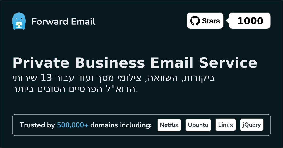 Forward Email⭐ מוּמלָץאימייל לכולם | $3/mo | 10 GB pooled | 50 MB | כֵּן | כֵּן | כֵּן | כֵּן | TTI | כֵּן | כֵּן | כֵּן | כֵּן | ⚠️ Opt-in | כֵּן | כֵּן |