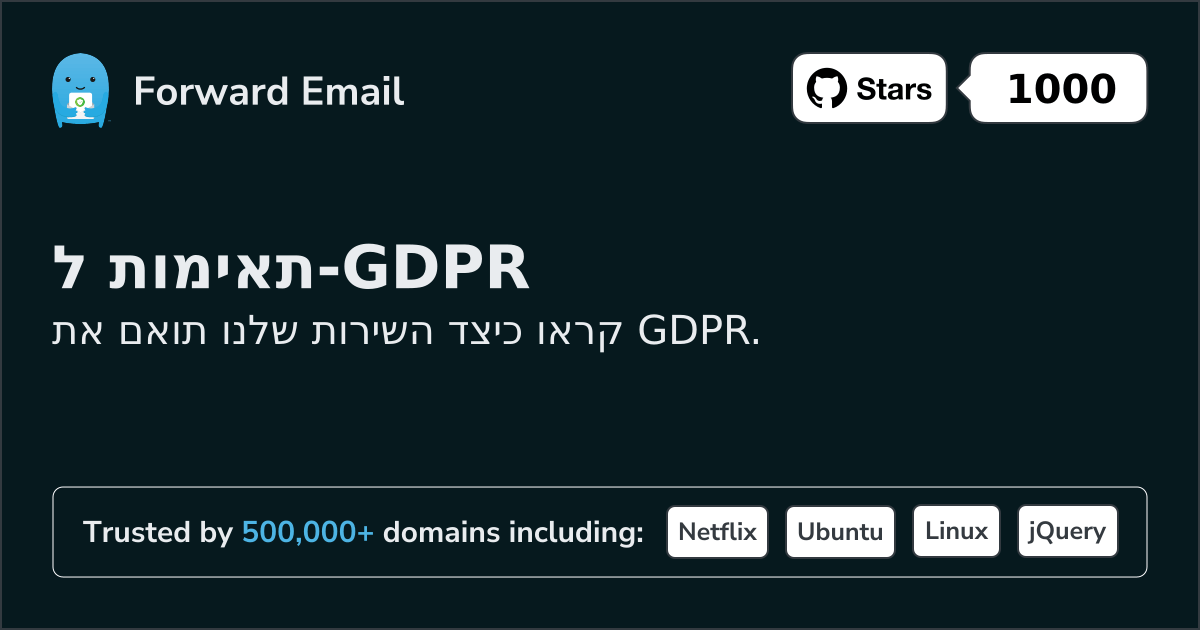 בכל עת תוכל לשנות את המידע האישי שלך תחת החשבון שלי → פרופיל ואף למחוק את כל החשבון שלך ואת כל המידע הקשור תחת החשבון שלי → אבטחה. מכיוון שאנו קוד פתוח לחלוטין ב-https://github.com/forwardemail – ניתן גם לבדוק את קוד המקור שלנו כדי לוודא שהוא עומד בחוקי הפרטיות בכל עת.