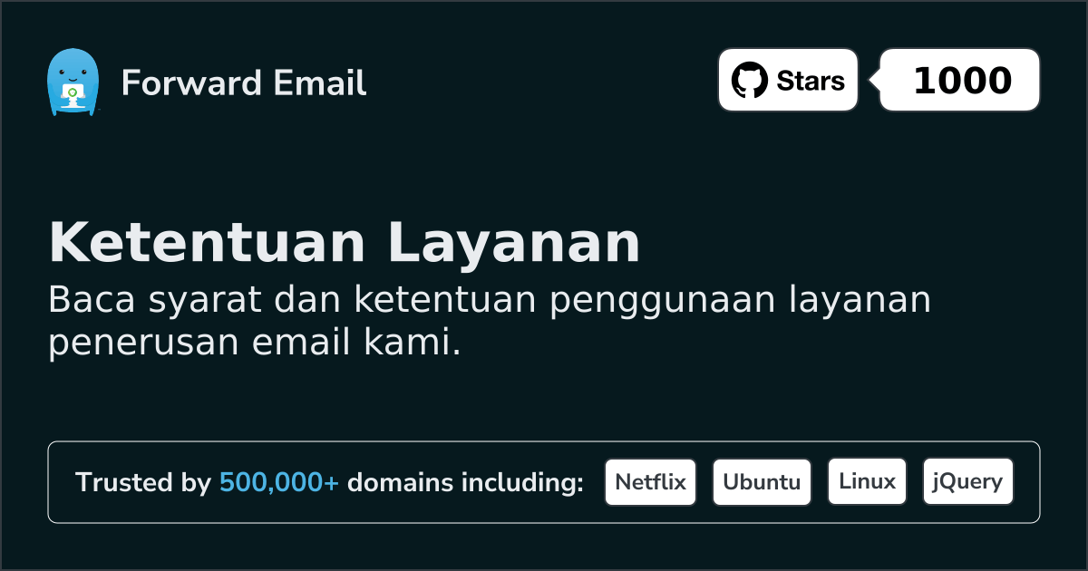 Forward Email dapat merevisi ketentuan penggunaan situs web ini kapan saja tanpa pemberitahuan. Dengan menggunakan situs web ini, Anda setuju untuk terikat oleh versi Syarat dan Ketentuan Penggunaan yang berlaku saat itu.