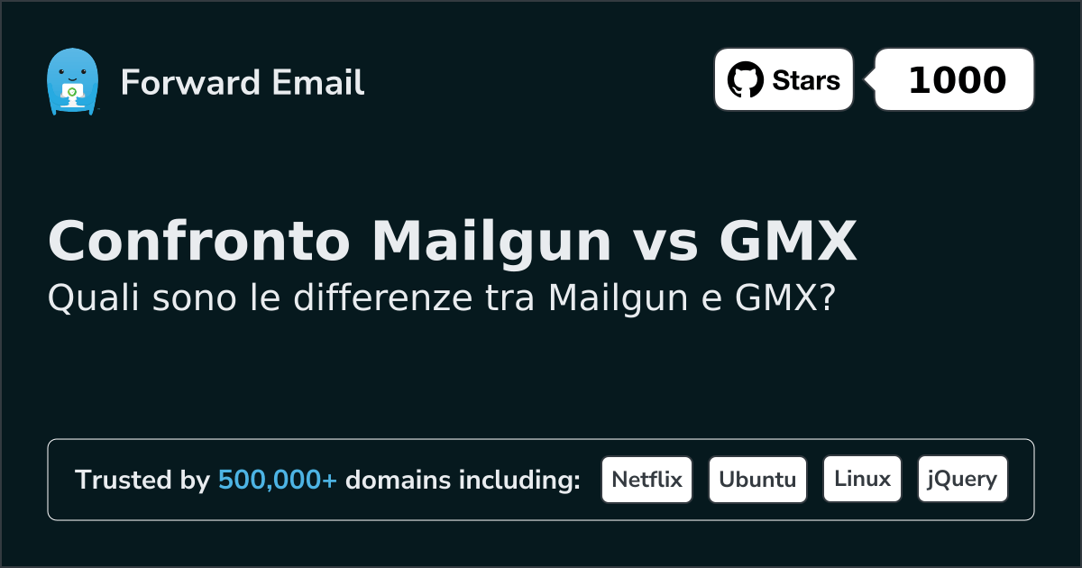Mailgun"Piattaforma di invio di e-mail flessibile, scalabile e orientata ai risultati" | contro | GMX"Crea rapidamente un account email gratuito" |