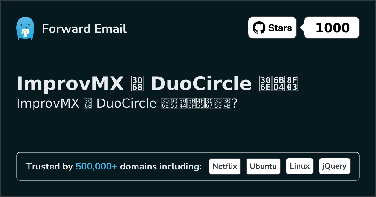 ImprovMX"ドメイン名に無料のメールエイリアスを作成する" | 対 | DuoCircle"フィッシング、スパム、マルウェアからメールを保護する" |