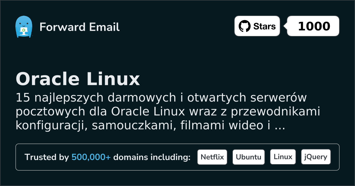 Forward Email to e-mail serwer o otwartym kodzie źródłowym dla Oracle Linux. Oficjalny opis na stronie internetowej brzmi: „Szyfrowana poczta e-mail z dbałością o prywatność. Jesteśmy usługą pocztową dla setek tysięcy twórców, deweloperów i firm. Wysyłaj i odbieraj e-maile jako ty@twojadomena.com, korzystając ze swojej własnej domeny lub jednej z naszych.”