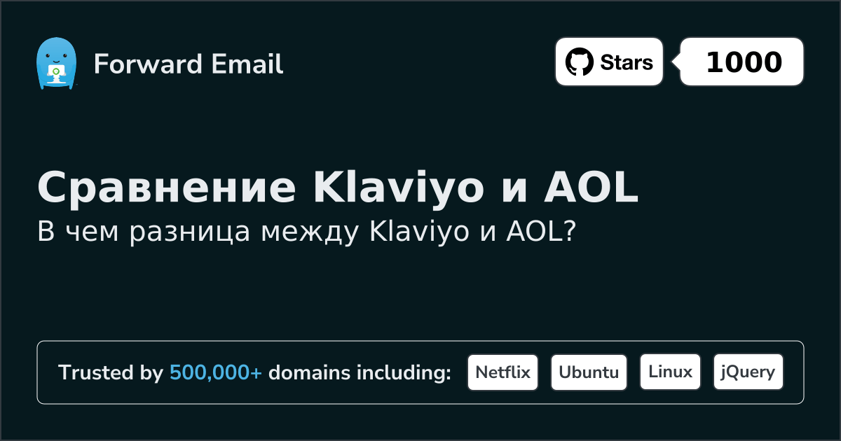 Klaviyo"Энергия более разумных цифровых отношений" | против. | AOL"AOL Mail — бесплатная веб-служба электронной почты, предоставляемая AOL, подразделением Yahoo! Inc." |