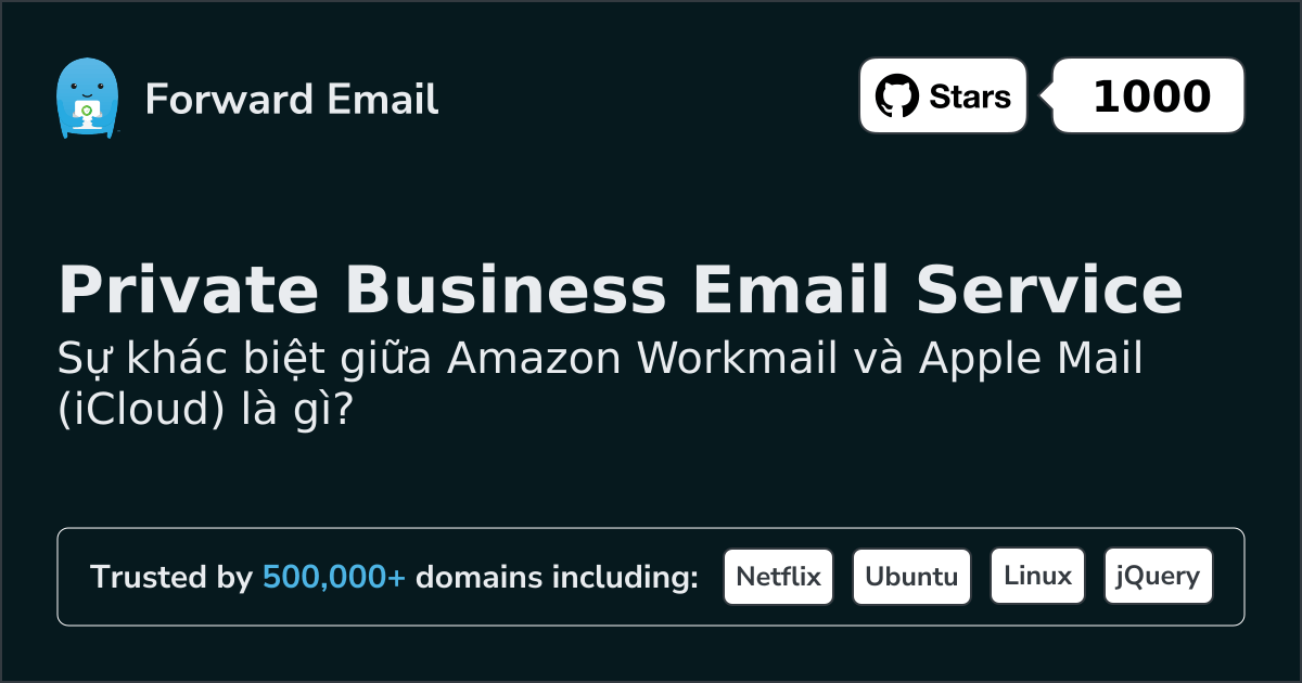 Amazon Workmail"Amazon WorkMail là dịch vụ email và lịch kinh doanh được quản lý an toàn, hỗ trợ các ứng dụng email dành cho máy tính để bàn và thiết bị di động hiện có" | so với | Apple Mail (iCloud)"Email riêng tư, an toàn và cá nhân từ Apple" |