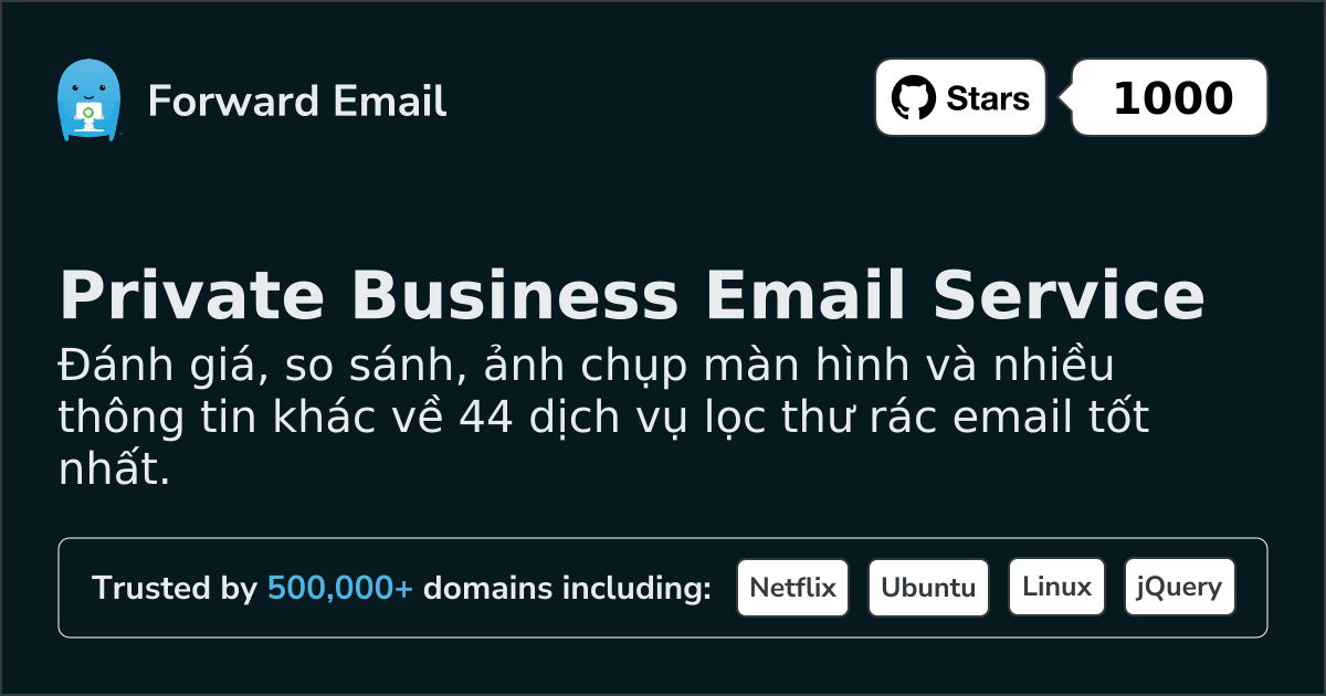 Spam ScannerSpam Scanner là dịch vụ chống thư rác, lọc email và ngăn chặn lừa đảo tốt nhất | Free (built-in to Forward Email) | Requires 3rd party | Unknown | KHÔNG | KHÔNG | KHÔNG | KHÔNG | KHÔNG | ❌ Requires 3rd party | ❌ Requires 3rd party | ❌ Requires 3rd party | Đúng | KHÔNG | KHÔNG | KHÔNG |